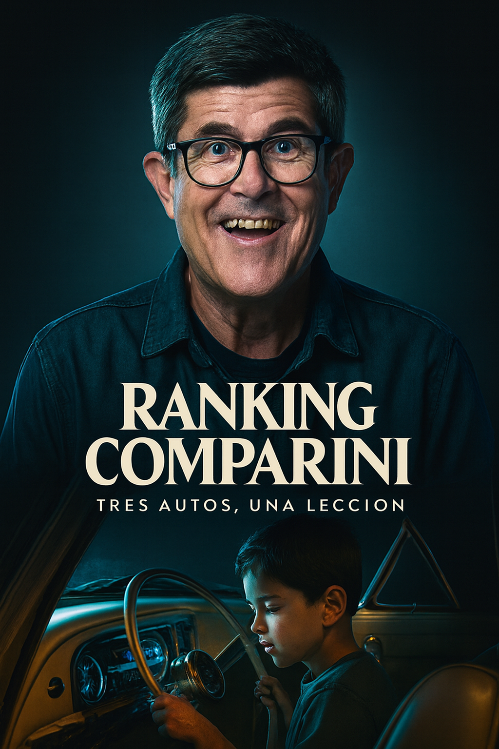Año 1972. Marcelo niño en un Fiat 125 crema, mira el tablero fascinado. Voz de Marcelo: «Mi viejo decía: hay que elegir bien el auto… y cuidarlo.» Corte rápido al Marcelo joven, 1983, manejando un Toyota Celica con música ochentera: «Tenía razón. Hay autos que suenan bien. No solo el motor.» Salto a 2025: Marcelo en un auto eléctrico, sonríe mientras escucha: «Y en el número uno del Ranking Comparini, un clásico de 1972…» Marcelo se mira en el retrovisor: «Elegir bien siempre importa. El auto, la música… y el seguro.»